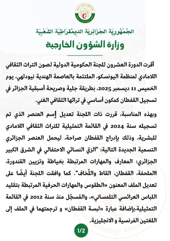 صادقت اللجنة و بالإجماع على تحديث عنوان الملف الوطني الجزائري،و تعديل إسم العنصر الذي تم تسجيله سنة 2024 في القائمة التمثيلية للتراث الثقافي اللامادي للبشرية، بإدراج القفطان صراحة، مما يرسخ التنوع الثقافي الجزائري، و كذا توسيع نطاق الإعتراف ليشمل الشرق الجزائري الكبير، حيث أصبح الملف الجزائري بعد تعديله يحمل عنوان ” الزي النسائي الإحتفالي النسوي في الشرق الجزائري الكبير : المعارف و المهارات المرتبطة بخياطة و تزيين القندورة، القفطان، القاط و اللحاف “، و هي الأزياء التي تمثل أصالة و عمق التاريخ الجزائري و إرثا يتوجب حمايته، كما وافقت اللجنة أيضا على تعديل الملف المعنون ” الطقوس و المهارات الحرفية المرتبطة بتقليد اللباس العرائسي التلمساني “، و المسجل منذ سنة 2012 في القائمة التمثيلية بإضافة عبارة ” لبسة القفطان “، و ترجمتها بالملف الى اللغتين الفرنسية و الإنجليزية
