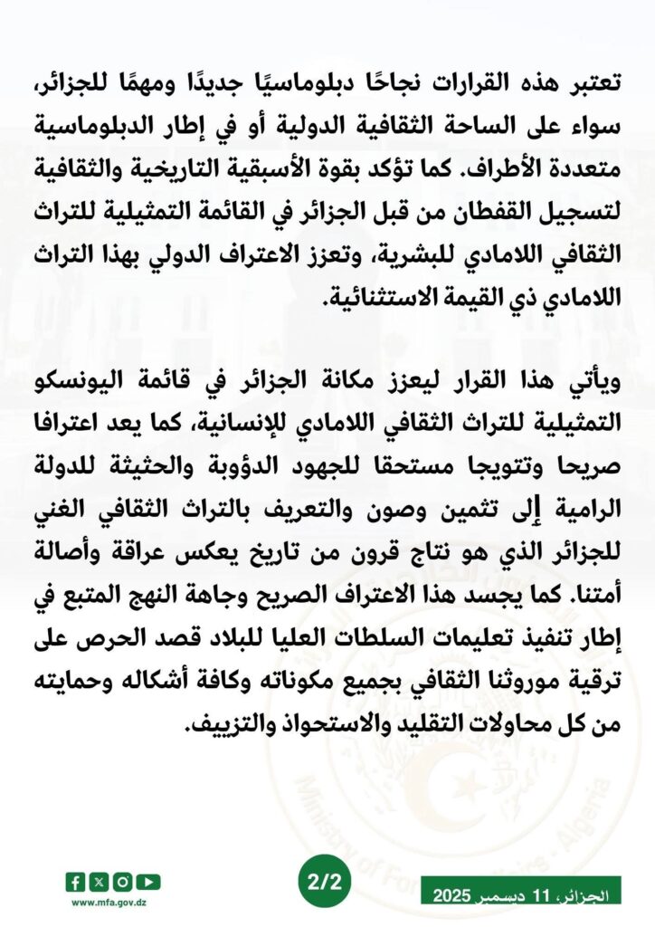 نجاحا دبلوماسيا جديدا للجزائر في الساحة الثقافية الدولية