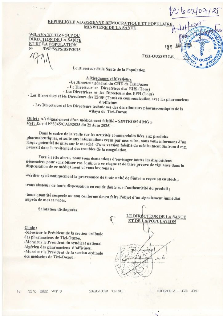 /و قد جاء موضوع هذه المراسلة بخصوص التبليغ عن هذا الدواء المقلد، بناءا على معلومات تلقتها مصالحه حول خطر محتمل لتسويق نسخة مقلدة من دواء Sintron بتركيز 4 ملغ، الموصوف لعلاج إضطرابات التخثر، و طالب مدير القطاع بتيزي وزو الجهات المعنية بإتخاذ التدابير اللازمة للتحسيس بهذا الخطر، و ممارسة أقصى درجات اليقضة في صرف هذا الدواء، حيث يتوجب أخذ الحييطة و الحذر في التحقق المنهجي من مصادر كل وحدة لهذا الدواء يتم إستلامها أو تخزينها، و في حال الشك في صحة المنتج يجب الإمتناع عن صرفه، مع ضرورة التبليغ عن أي كمية مشبوهة أو غير مطابقة، كما أرسلت نسخة من هذه الإرسالية الى كل من السيد رئيس الفرع النقابي للصيادلة بتيزي وزو، السيد رئيس النقابة الوطنية الجزائرية لصيادلة، و نسخة الى رئيس الفرع النقابي للأطباء بتيزي وزو
